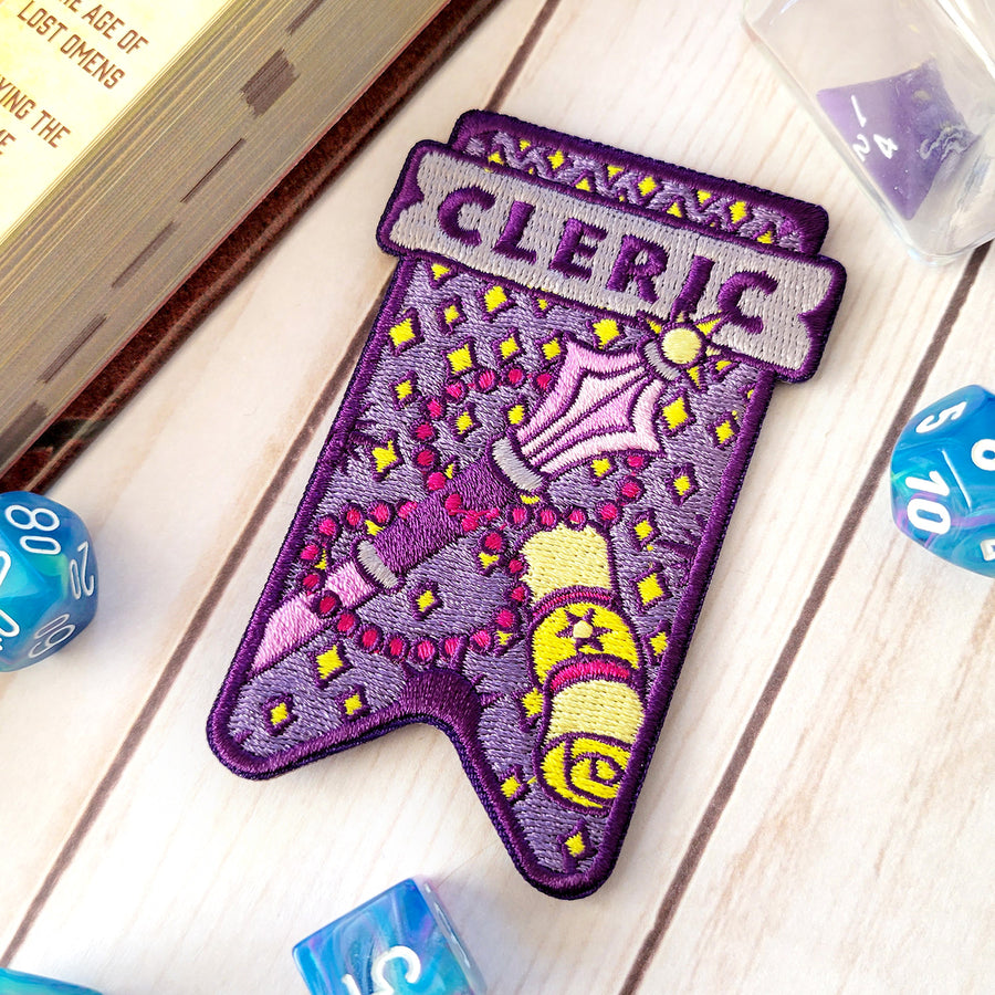 Presenting the Raise Your Banner patch collection, full of enchanting designs each tailored to a different D&D class (plus a Pathfinder class!). The Cleric design features a mace, prayer beads and a spell scroll.