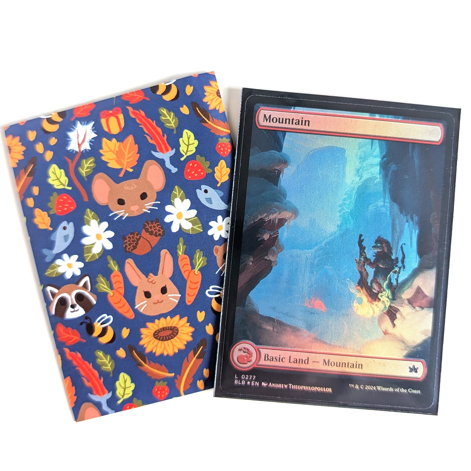 I decided to design card sleeves! The Bloomburrow set is a very popular in my house, everybody has a deck! Mine is cute little mice. This cute sleeves have a pattern of various forest animals, flowers, carrots, fish, swords, and more. The sleeves are matte on the back and have a smooth untextured feel.