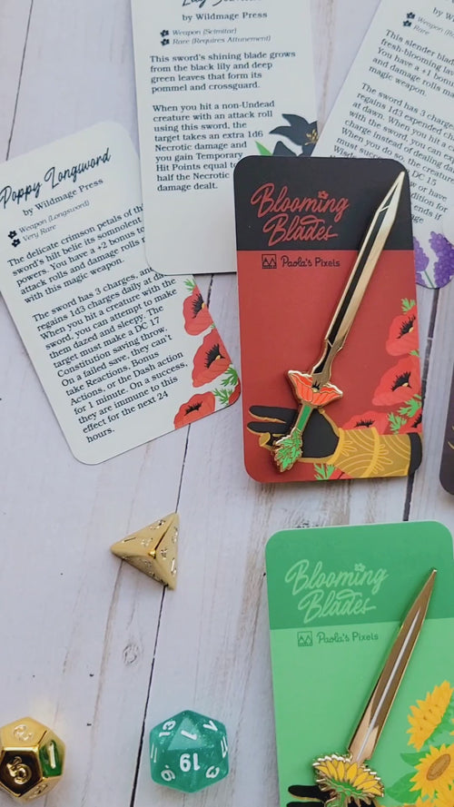 This enamel pin collection come with an item card for each design so you can use the swords in your 5th Edition D&D games.