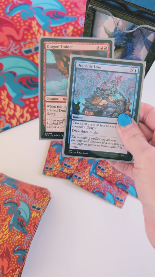 This sleeve design is inspired by red and blue Dragons MTG decks. The pattern features red and blue dragons, treasure, and hidden sol rings.
