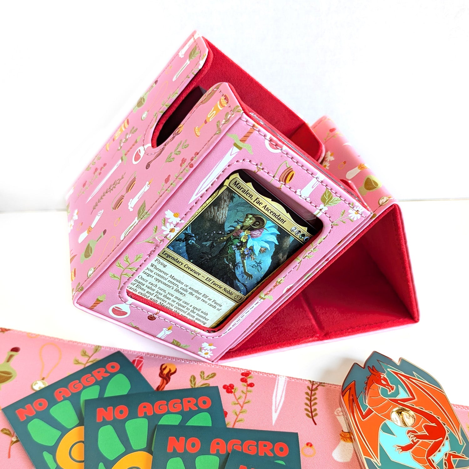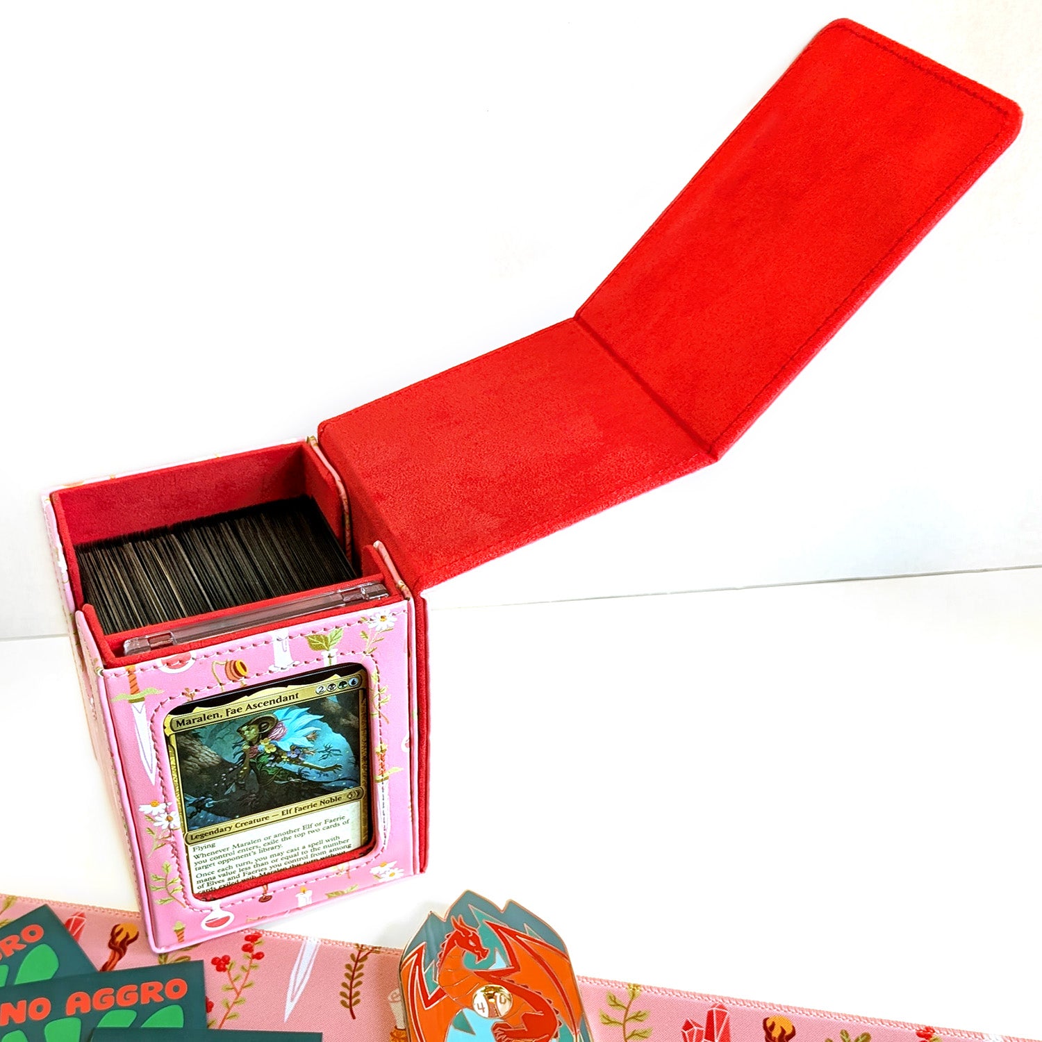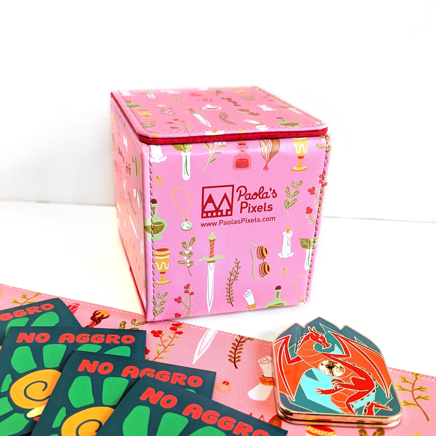 This pink box design was inspired by items a Spellcaster would have in their adventurer pack. The outside of the box has a bright pink print on PU leather and the inside is red felt.