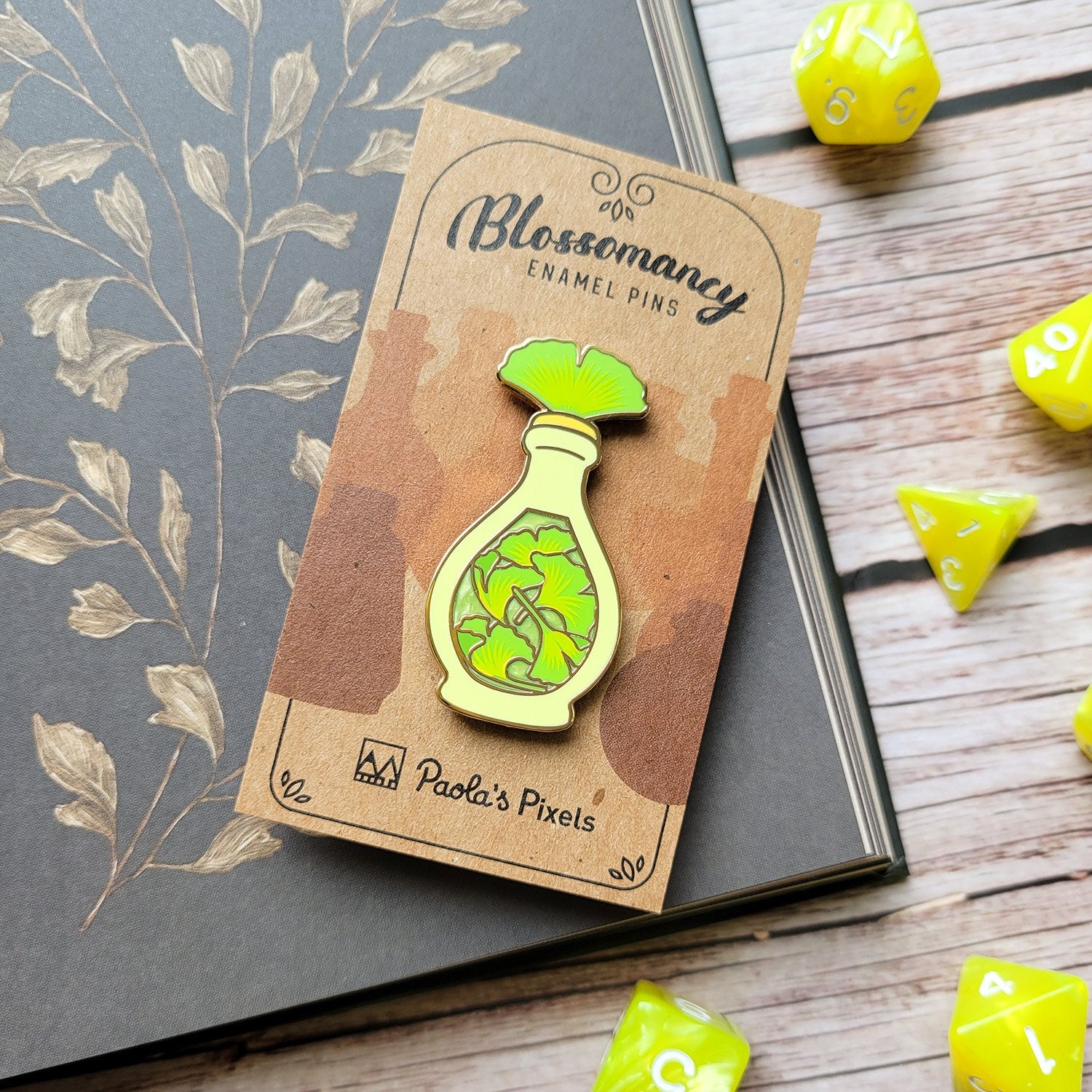 The Green Ginkgo Potion enamel pin is an adorable green potion bottle with gold plating, pearl effect inside the bottle and screen printed details.