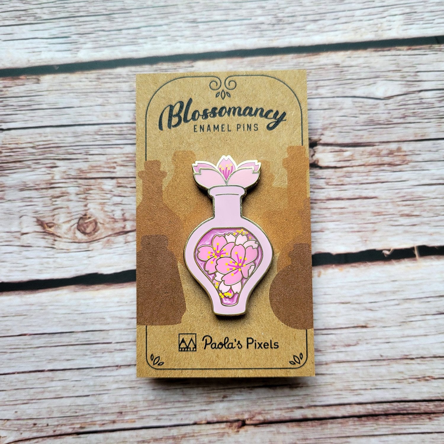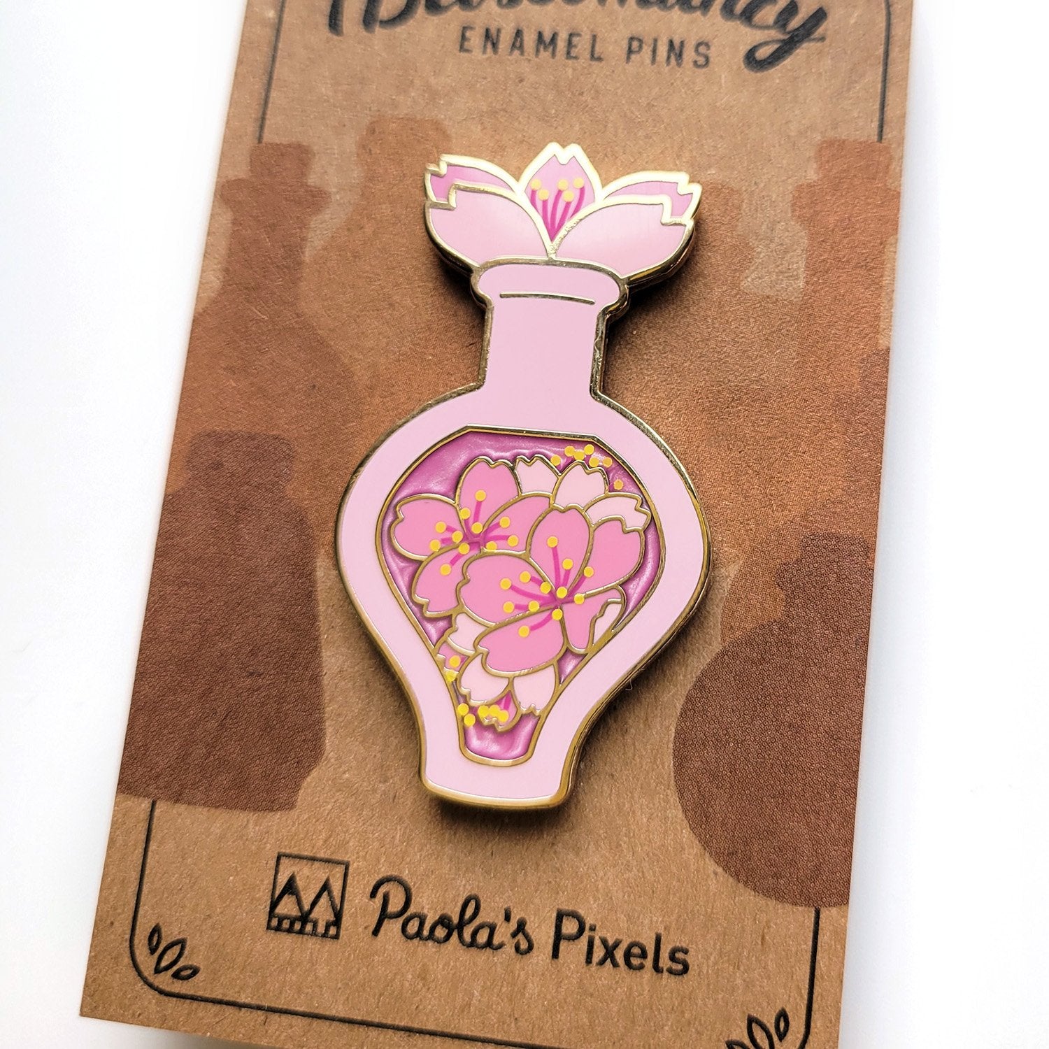 The Pink Cherry Blossom Potion enamel pin is an adorable pink bottle with gold plating, pearl effect inside the bottle and screen printed details.