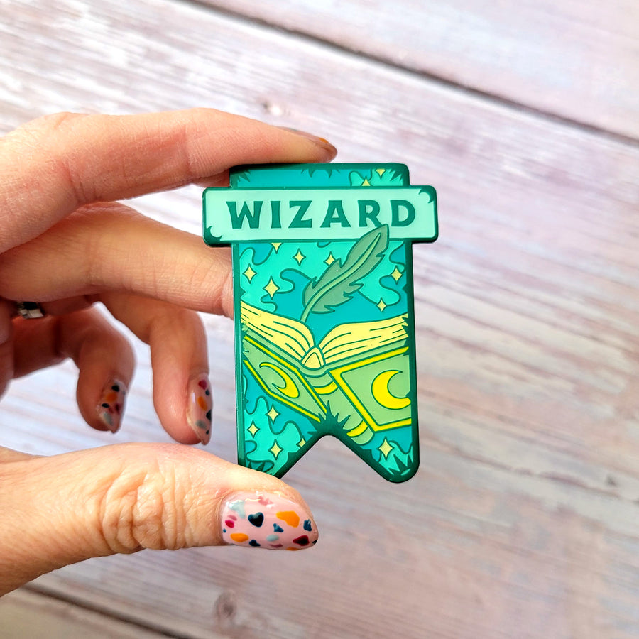 Presenting the Raise Your Banner pin collection, full of enchanting designs each tailored to a different D&D class (plus a Pathfinder class!). The Wizard design has a spell book, a quill and a shimmering spell on the background.