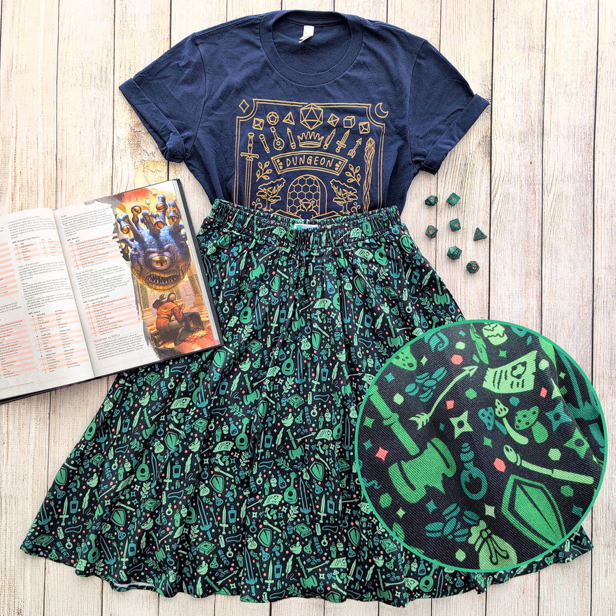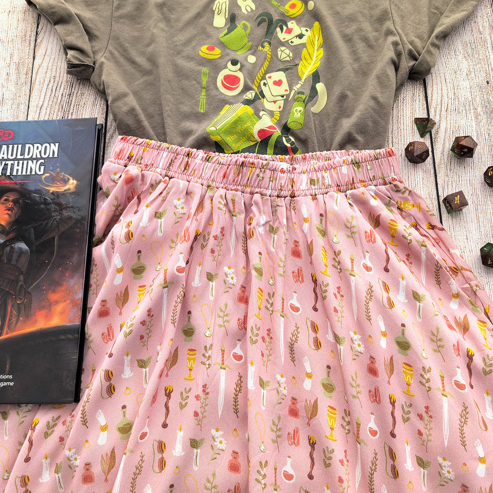 This purple dark and moody pattern is perfect as a midi skirt. The Dungeon Academia pattern is inspired by D&D and contains a sword, an axe, potion bottles, candles, scrolls, mushrooms, arrow, a mandolin, etc.