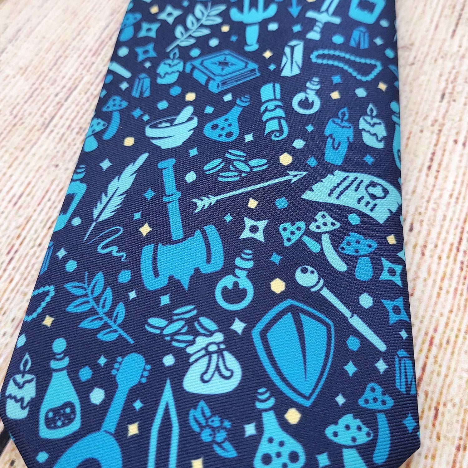 This dark and moody pattern is perfect for a tie. The Dungeon Academia pattern is inspired by D&D and contains a sword, an axe, potion bottles, candles, scrolls, mushrooms, arrow, a mandolin, etc.