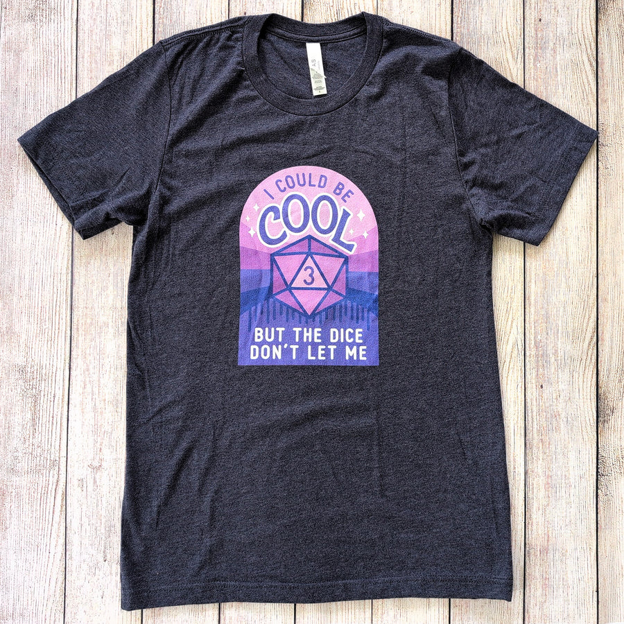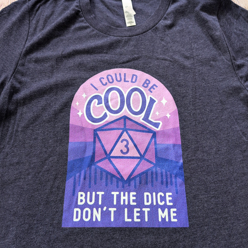 This tabletop design has several shades of purple and it says "I could be COOL but the dice don't let me", a d20 showing the number 3 is in the middle.