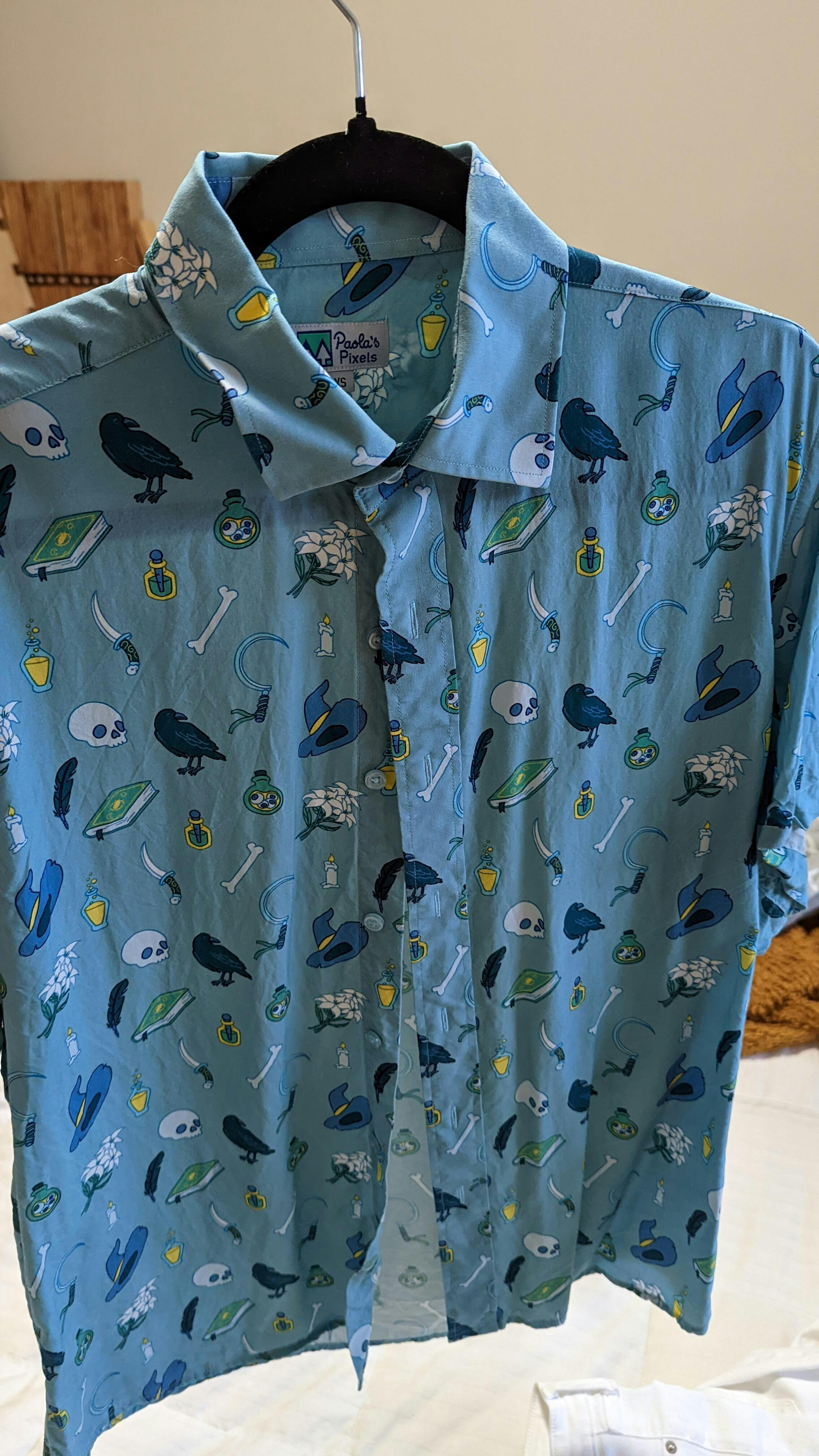This Necromancer pattern features some classic imagery like the crow, the skull, candle, poison and potion, a spellbook, a witch's hat and some lilies.